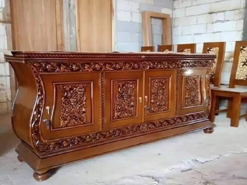 Bufet dengan warna coklat ini tidak akan lekang oleh waktu. Biasanya finishing coklat transparan. Tujuannya agar memancarkan keindahan dari serat kayu itu sendiri.